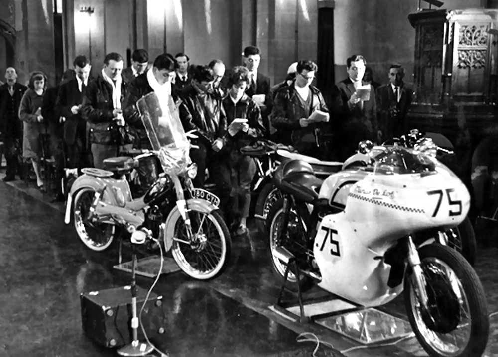 To drive home the idea we had arranged for a number of different bikes to be placed inside the church-symbolizing the offering of our machines to God. It was a strange assortment, ranging from a Tina scooter to a magnificent Manx Norton which had been raced the previous weekend.