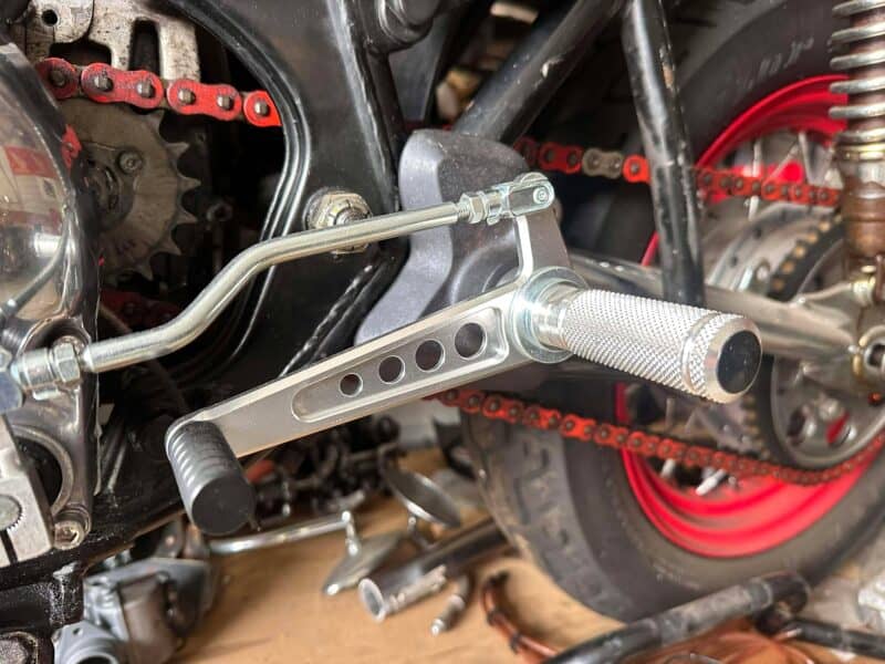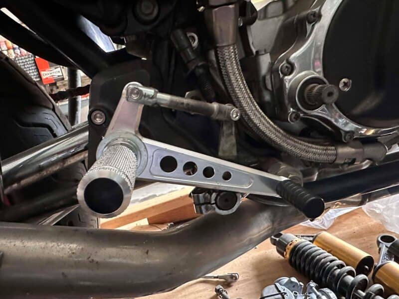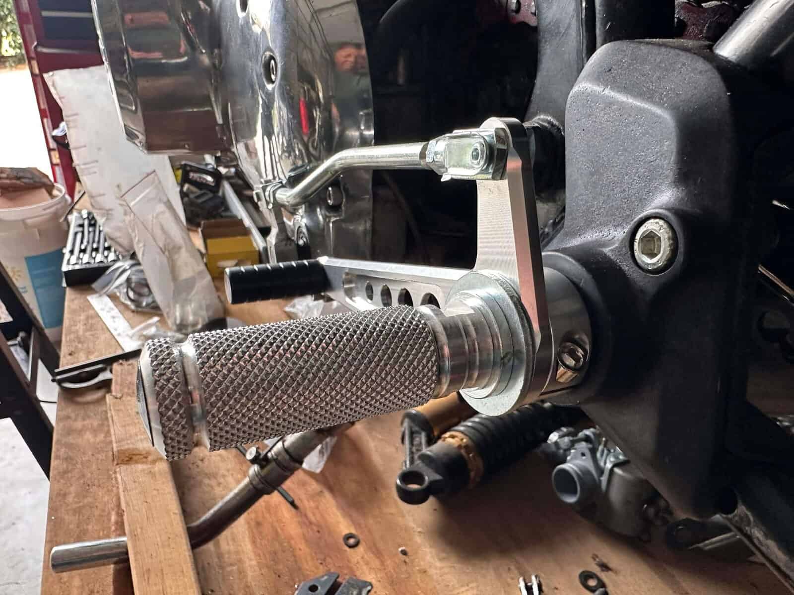 What you get is the Machined knurled footpeg mechanism, the drilled arm and toe shifter and brake pedal, and you simply make up your own round bar linkage to your length, like I did with mine, I used an old gear shifter and cut the foot shift off and welded an upright post with a hole in it and on the other side I used an old brake pedal and cut the foot part off to just use the broaching part to sit on the shaft and welded a tab to that so I can connect any linkage.
