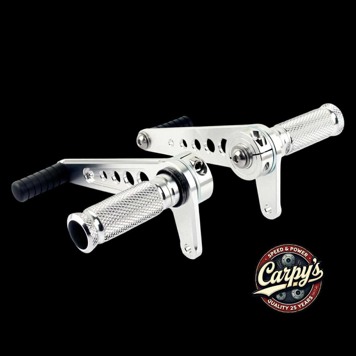 These are a compact set up and I have used this set you see here on a 1974 CB750K but you can easily adapt to fit ANY machine to be honest from Ducati to BMW to be honest. just a little imagination and patience and you will soon be laying on your bike and getting into them corners like you want to as stock pegs bring your feet too far forward if you are using clubman bars etc.