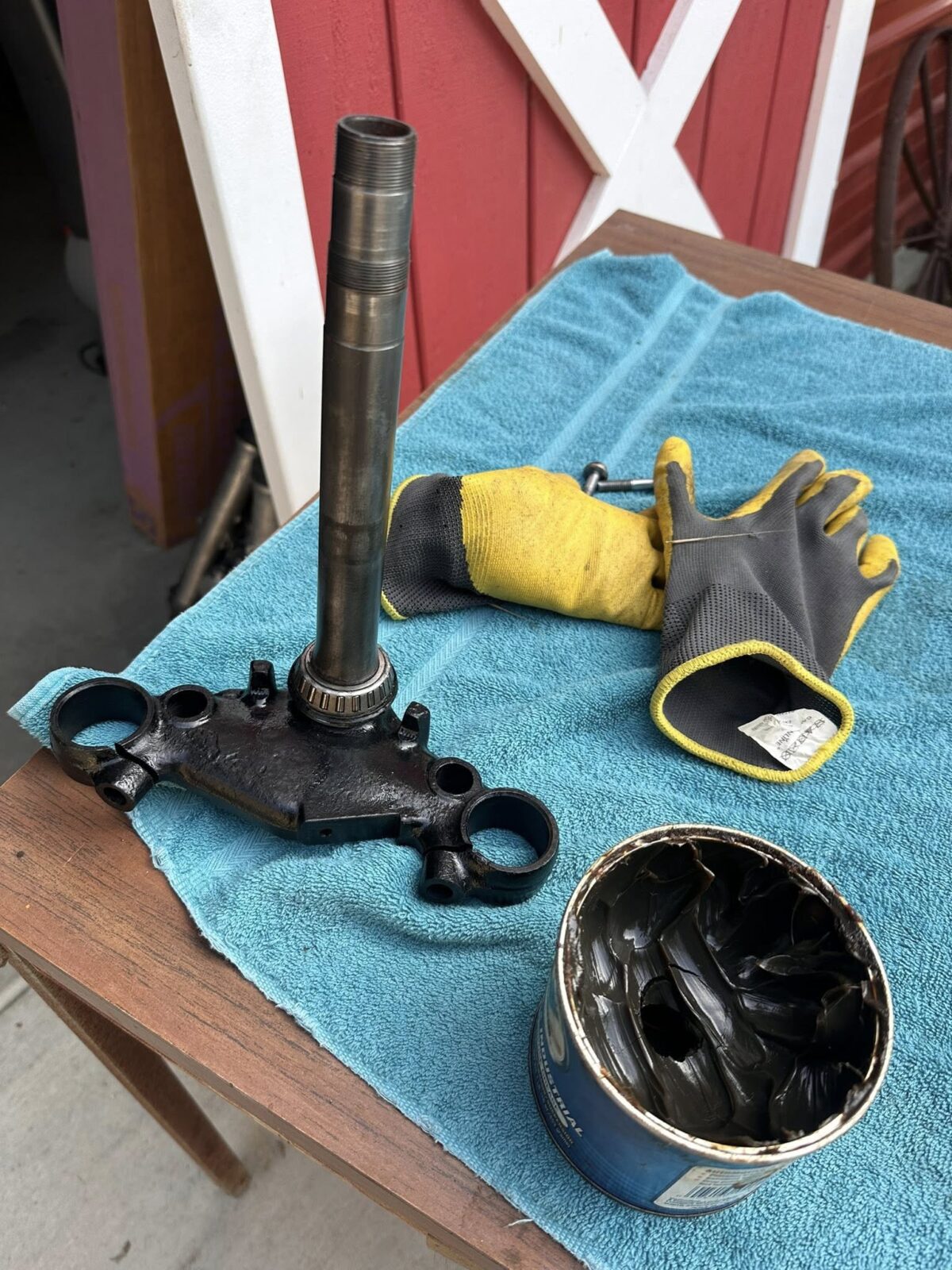 bearings in place and now a good dab of grease into the race in the frame and around the roller bearing, this is a 1978 CB750K front end of which I cleaned up and am now ready to assemble back into the bike and get that part of work out of the way and a tick of the list of many things that i have to try and address.