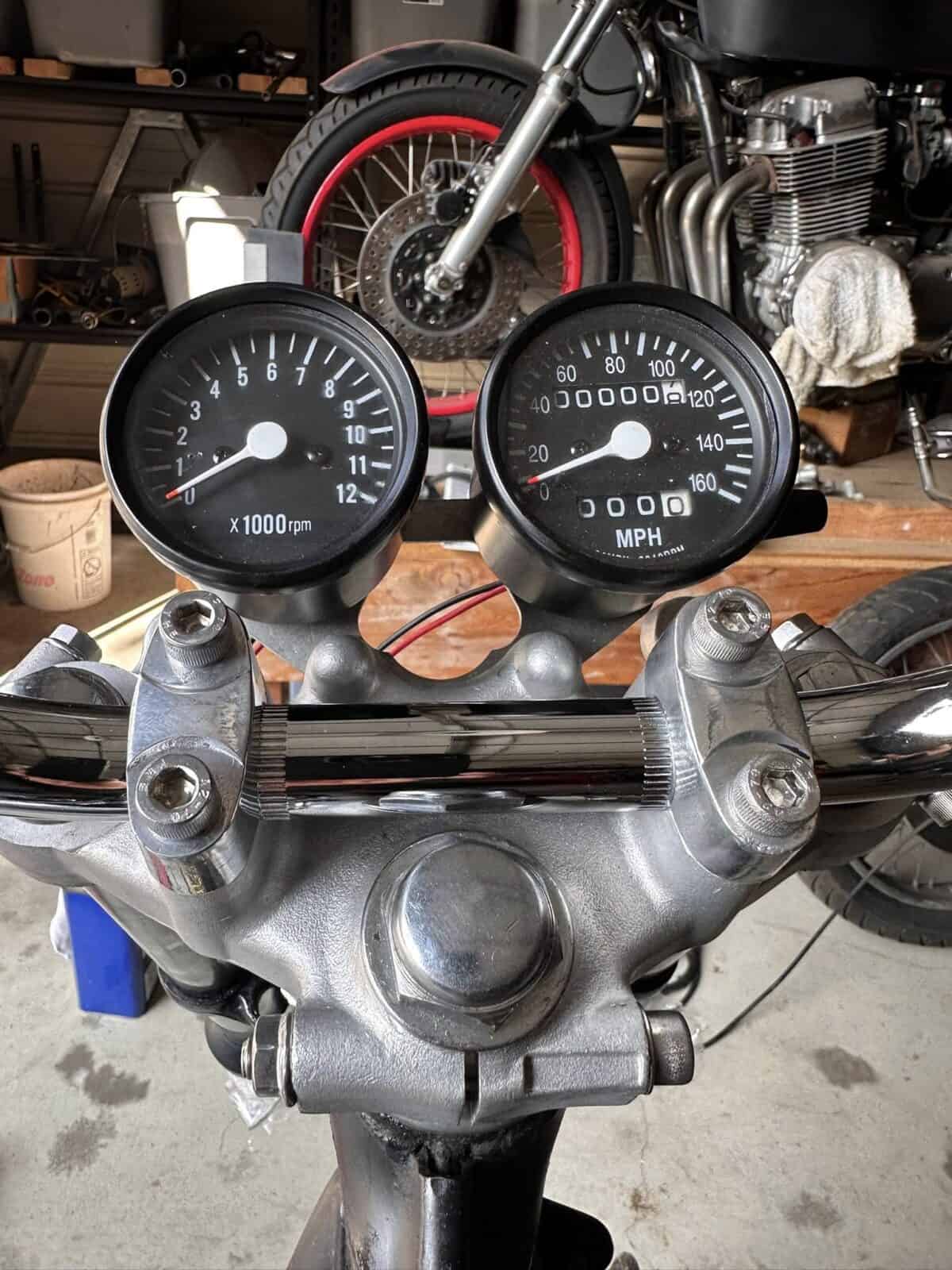 I vapor honed the upper triple tree for a cleaner look, fitted a set of my own Chromed handlebars and hand polished the handlebar holders, after that I fitted a new set of Black 2.5 Mini gauges to clean the top of the bike up as I am not a fan of the huge gauges on a custom machine if they are plain stock, and believe this is a tidy set up for what i am creating, but each to their own when they build there’s, I just like it with these smaller gauges in this particular build.