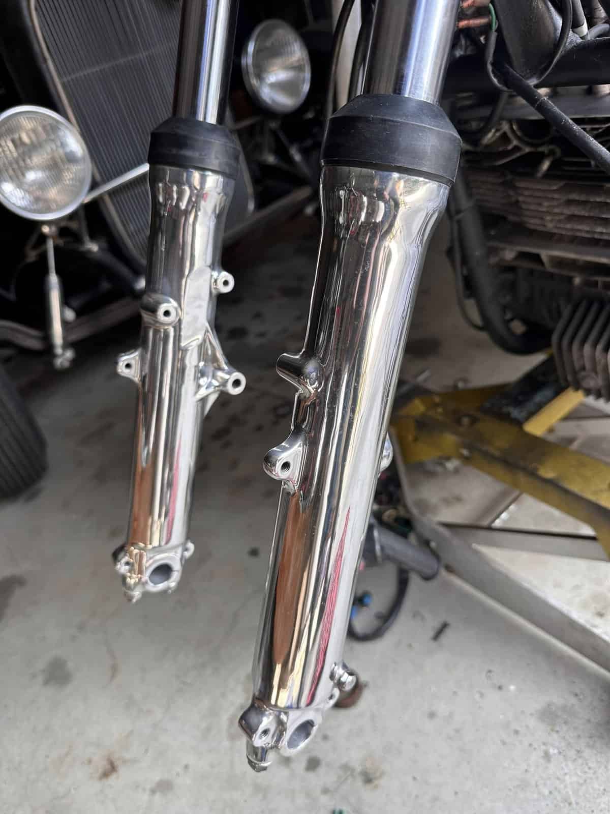That is so much better and many years of grime an road dirt have now been removed as I polished these right here, then fitted new fork tubes which are 3 inch under in length to slam the bike a little more in the front, added new seals and dust caps too, I am loving this now and it steers so smoothly as it should.