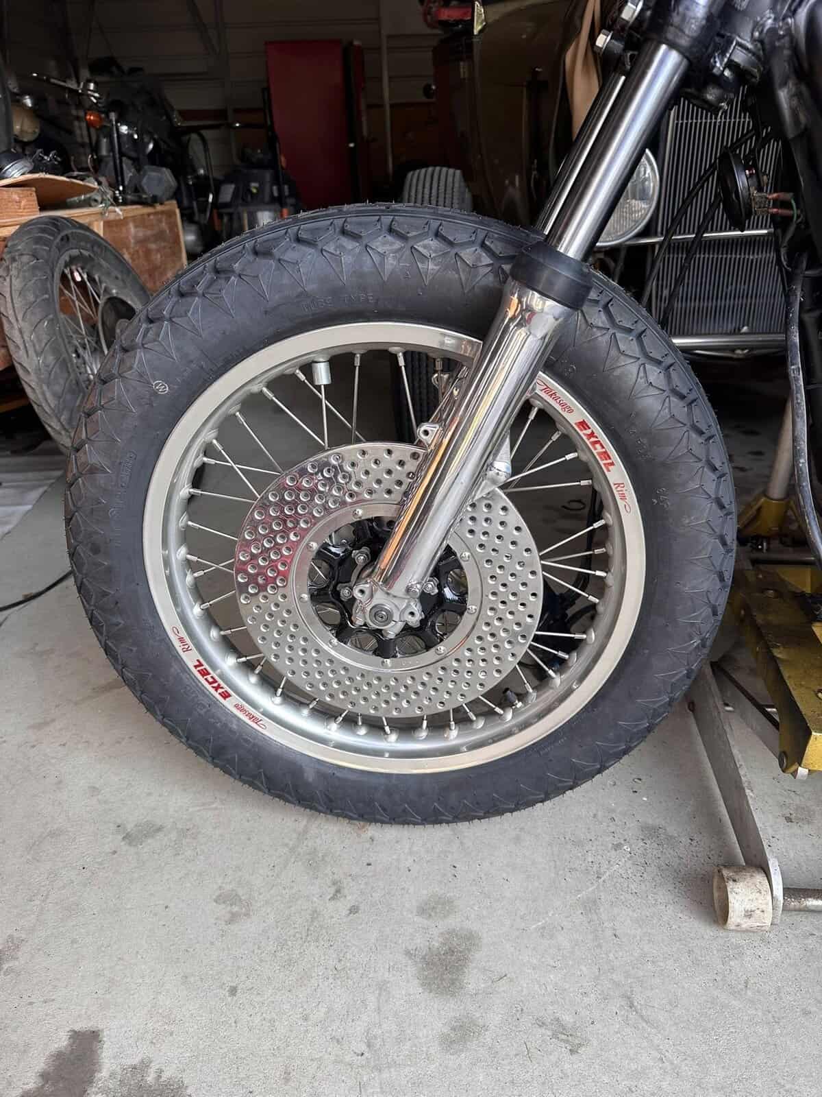 This time I wanted to have this a little beefier at the front, not only did I get rid of the old front wheel, I rebuilt another but used an aluminum Excel rim and re-spoked the hub, then drilled the brake rotor and painted the center black like factory, its a nice contrast and that Fat Diamond treaded tire is so Nostalgic and am glad that i went in this direction.