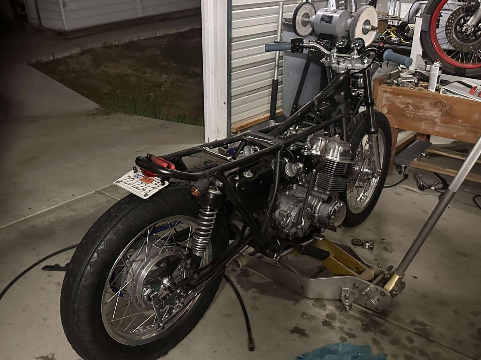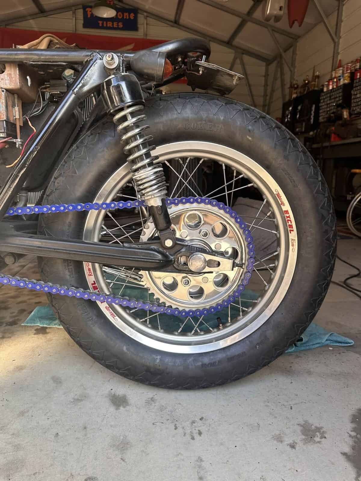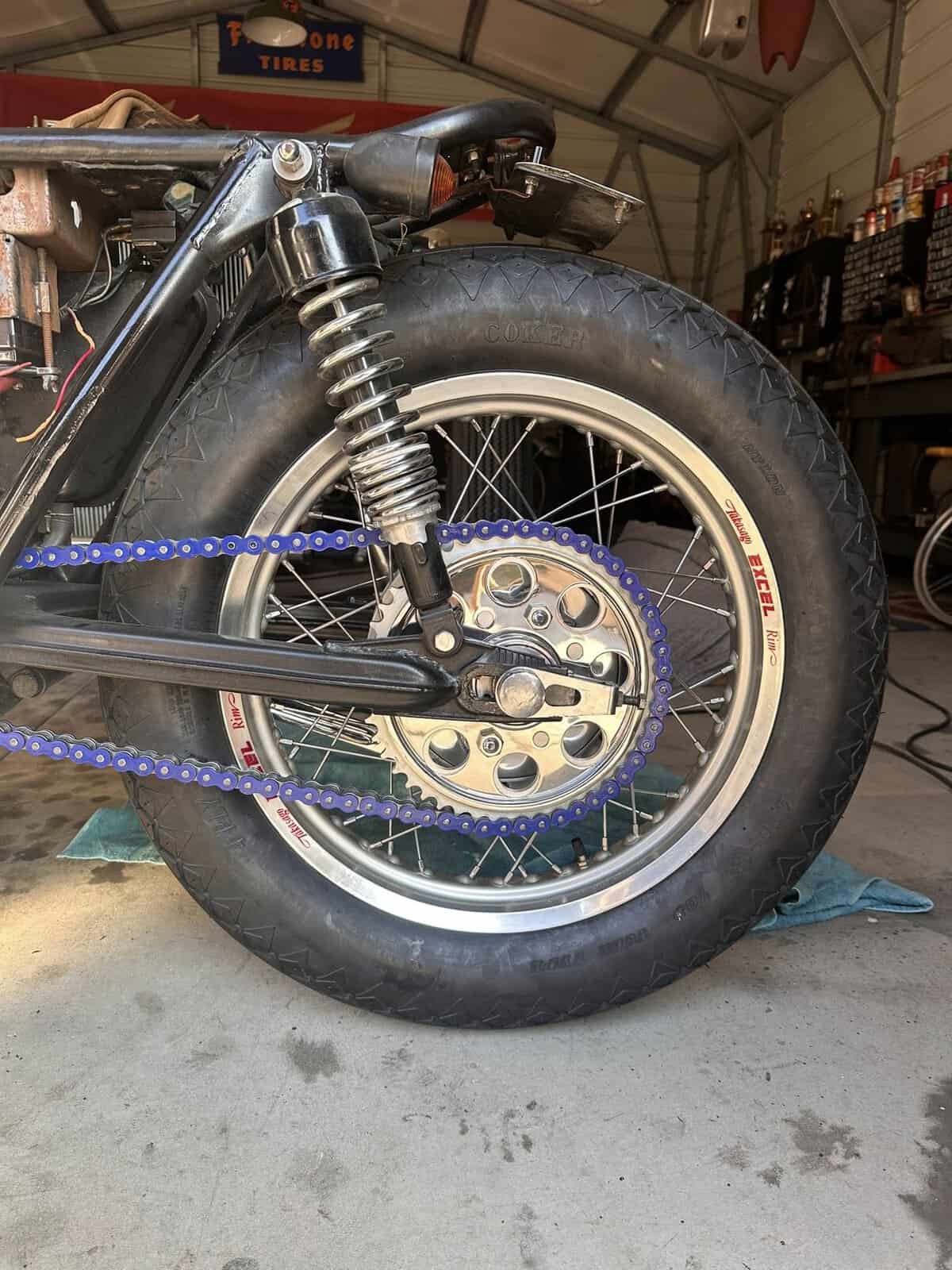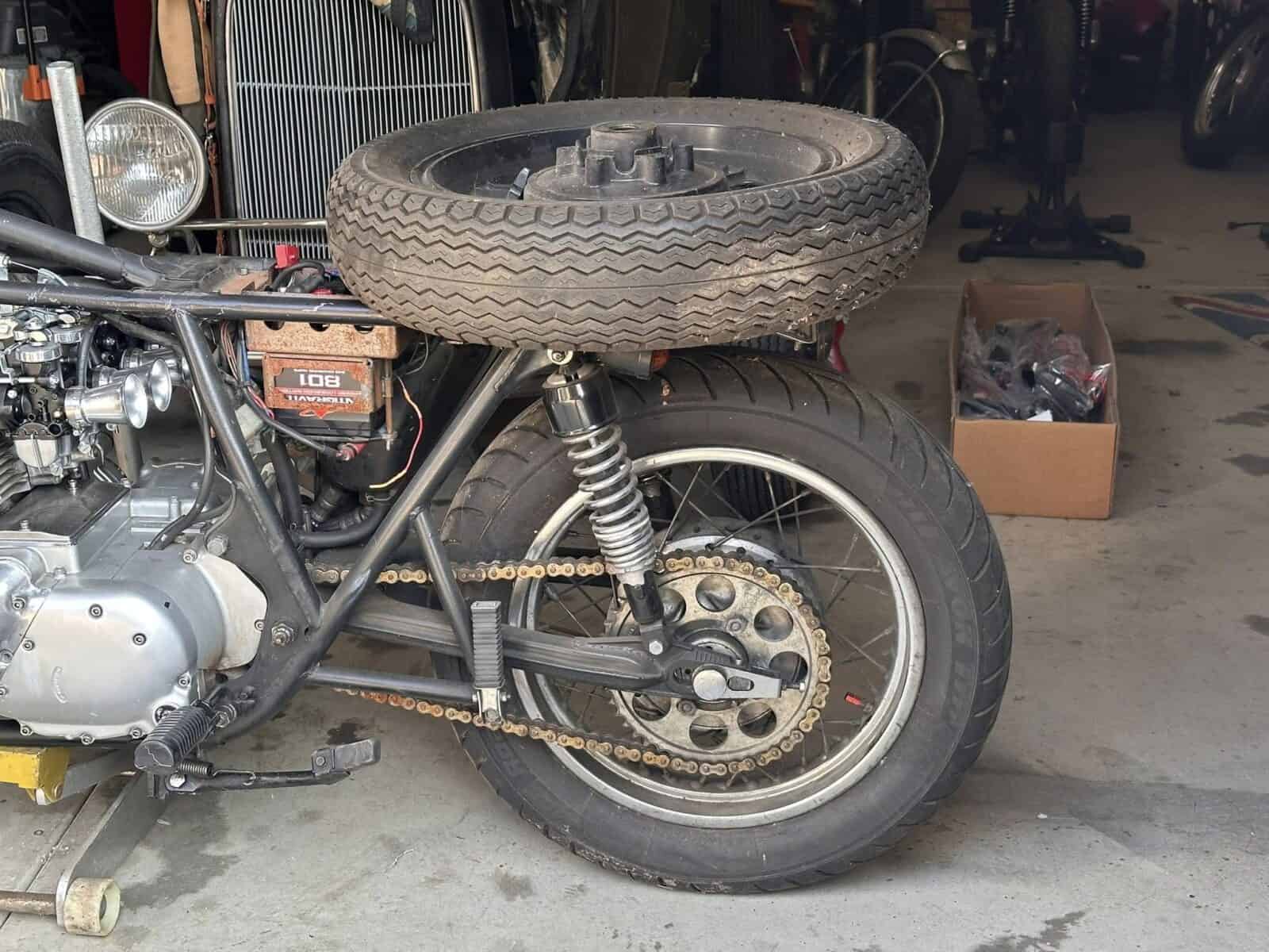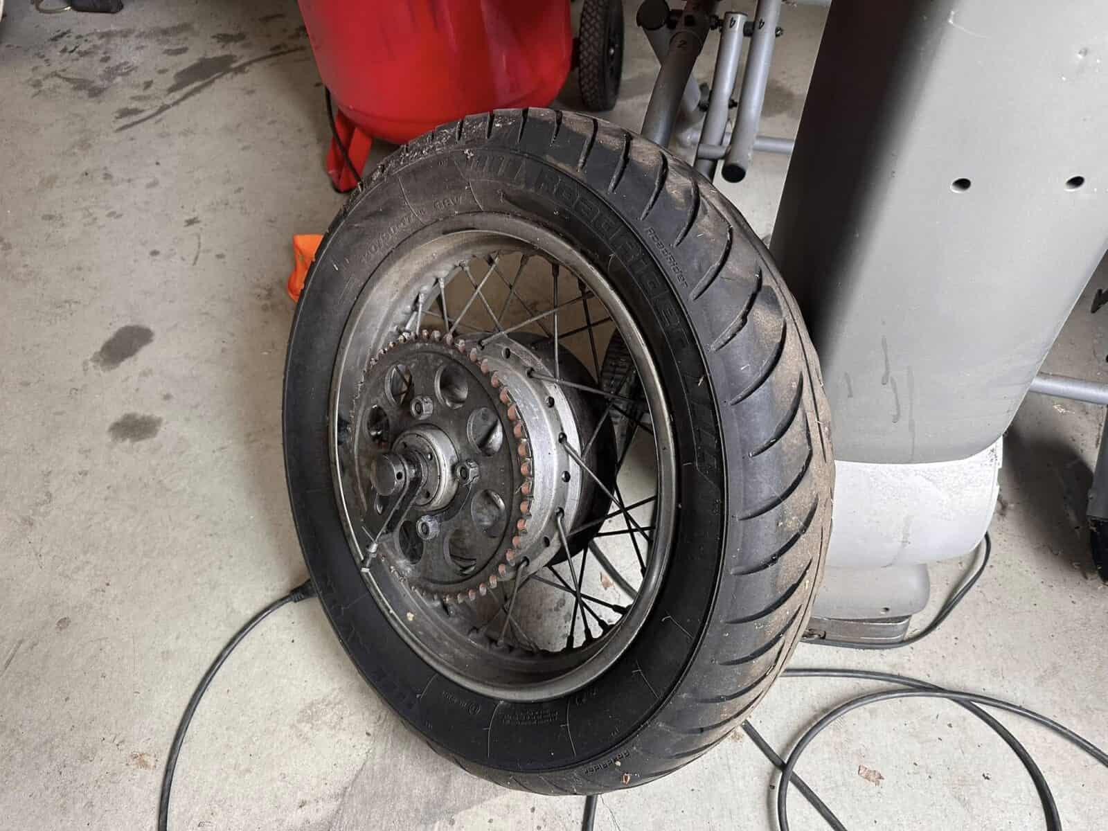 I forgot how heavy these rear wheel are, especially with 40 pounds of old air still in the tire, but I got it out of the swing arm and got rid of the chain as it was rusty, now this will have a brand new set of rims to give her a new look.