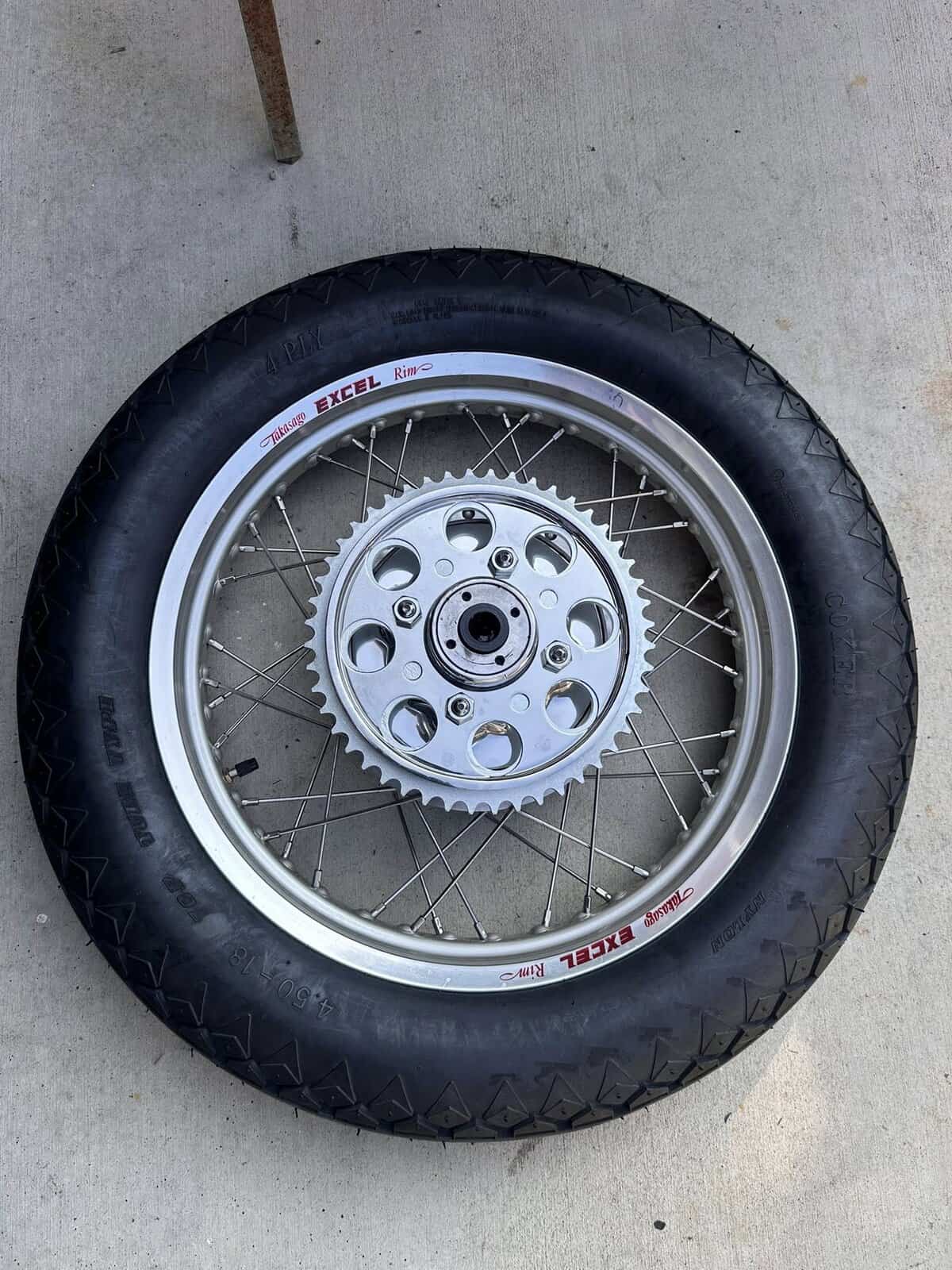The rear wheel was bugging me, as it has seen a better life and now that I have a New aluminum rim up at the front end, I may as well build one for the rear so it all matches to some extent, so it was time to remove the old 17 inch stock rear model and build a fresh 18′ alloy version.