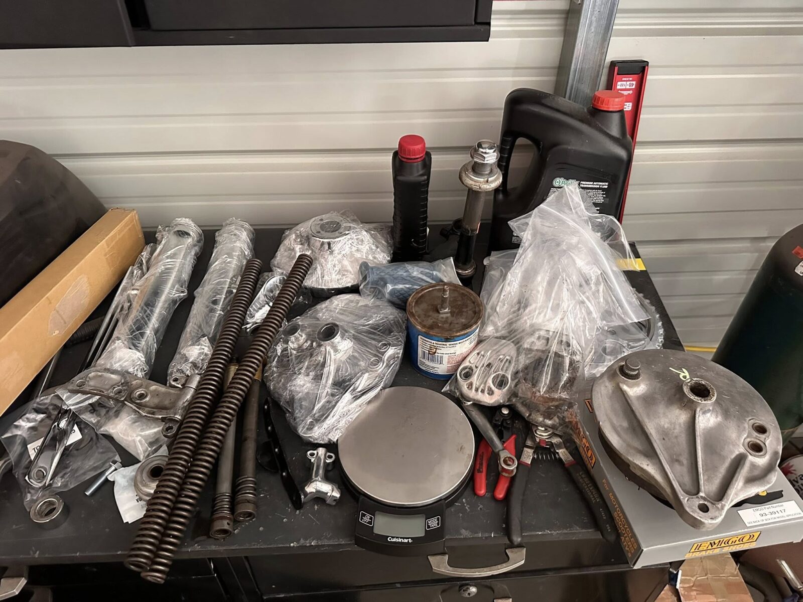 I have a bunch of parts I needed to polish, so got on with that and made a pile of parts on my bench in my barn, so i can simply just get on with a front end rebuild and not be hunting for parts whilst the frame is precariously balanced on a hydraulic jack. I even have an electric scale so i can weigh out my fork oil, well, I use ATF to be honest, always have, just like the race guys did back in the day.
