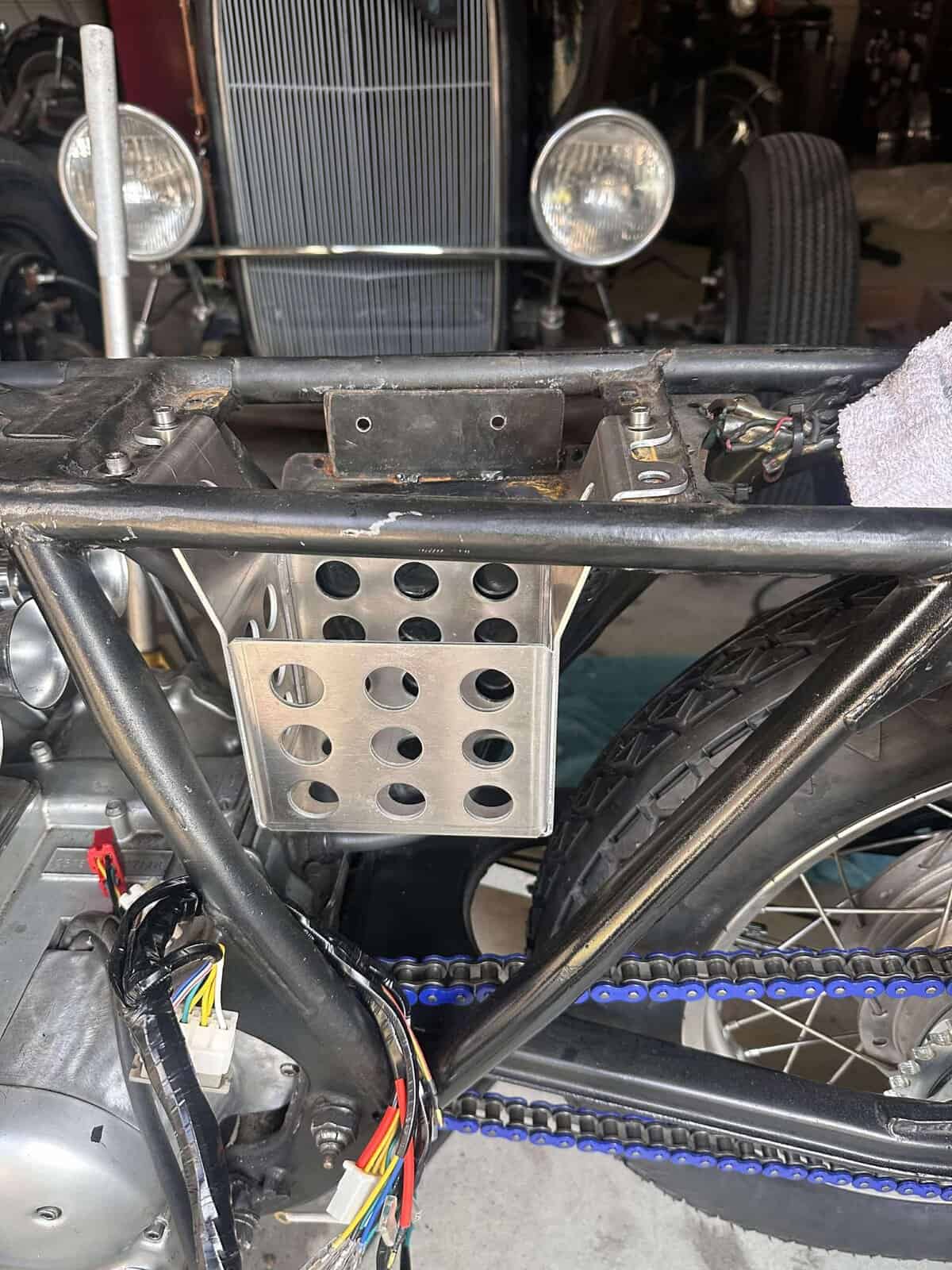 Made up one of my aircraft aluminum battery boxes to fill the void in the frame, the old one that was in there was rusty and needed a new life and look, so this fitted the bill nicely. Whilst i was there I got a new wiring harness out of my parts, so this will be reliable electrics, nothing worse than 40 year old tired wiring and these colors match lol.